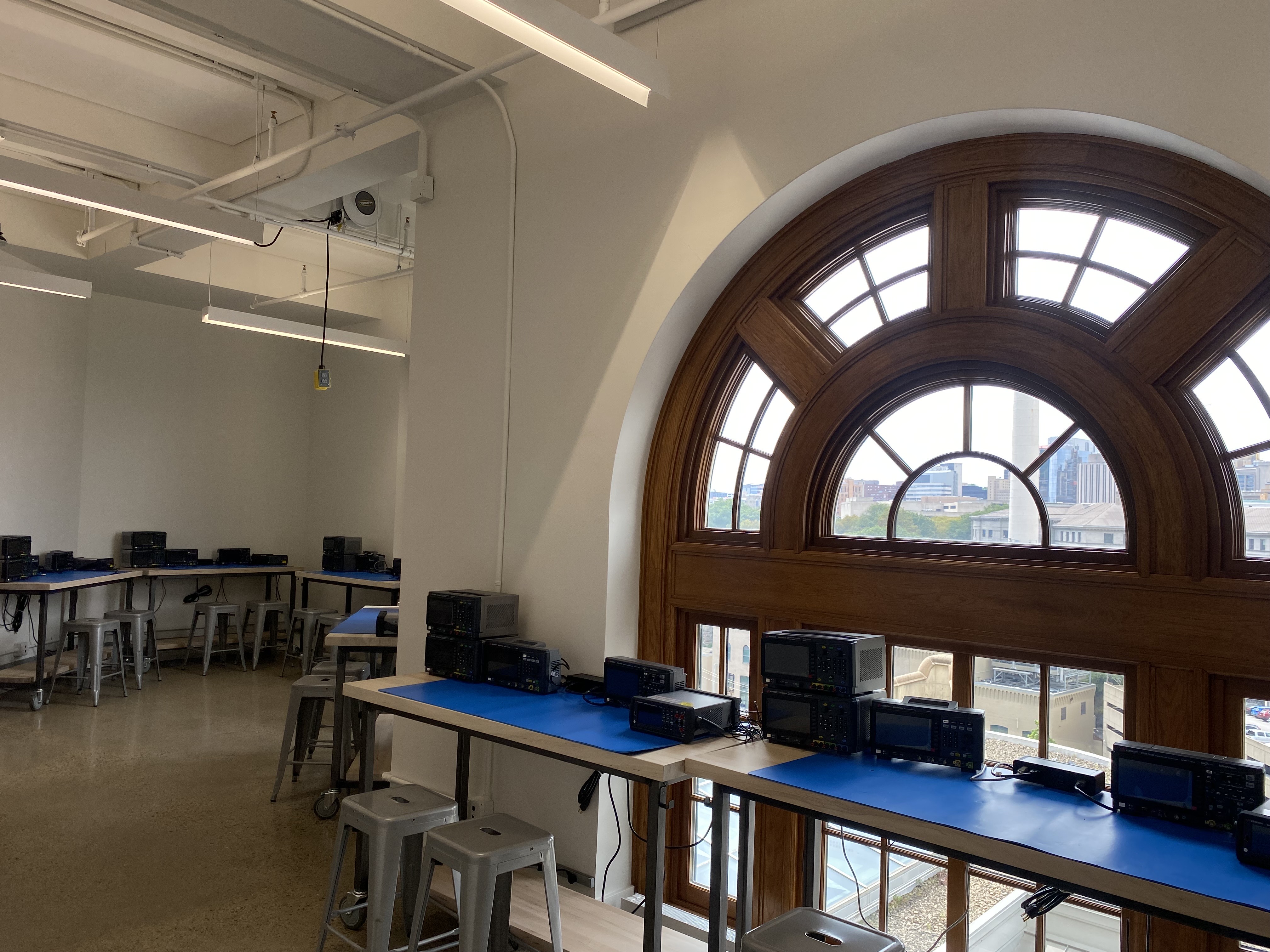 This lab features 16 work benches, each with a workstation. These benches are along the wall of the lab to facilitate an open working environment. The OS for the workstations is Windows and each bench is equipped with an oscilloscope, digital multimeter, function generator, and power supply. Four tables in the middle of the room allow for group meetings.